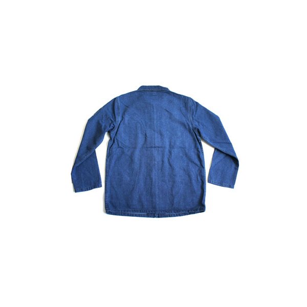 当製品は1960年代に日本でよく見かけたデニムのカバーオールをもとに製作しており、胸に刺繍、袖に内燃機関士の2等海曹階級章パッチを取り付けています。